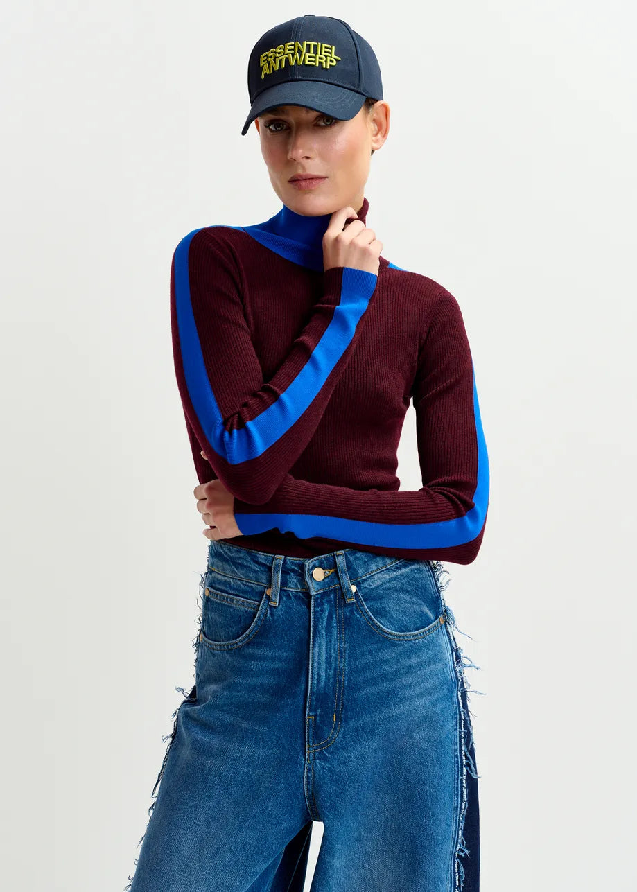 Questa maglia a collo alto dalla vestibilità aderente è realizzata in misto lana con poliestere riciclato e presenta una texture interamente a costine. Il design bicolore, con tonalità a contrasto tra fronte e retro, è valorizzato da un collo alto asimmetrico. Completata da finiture a costine, è un capo raffinato ma di grande impatto.