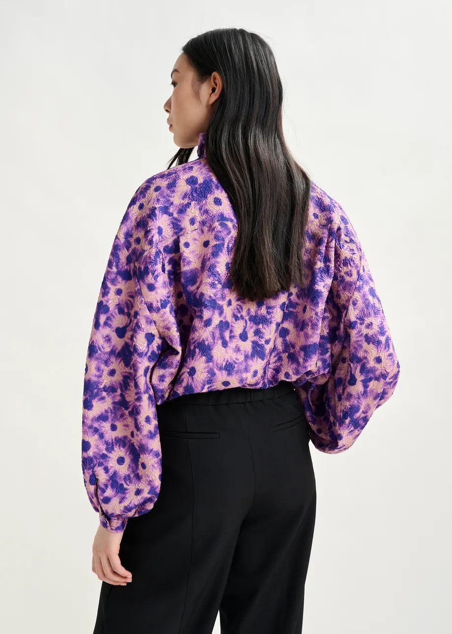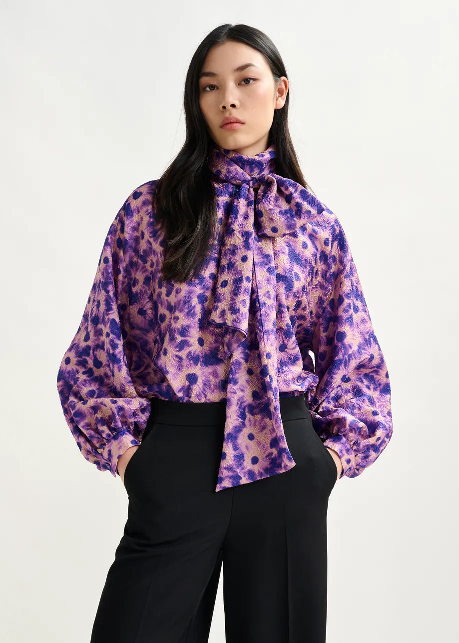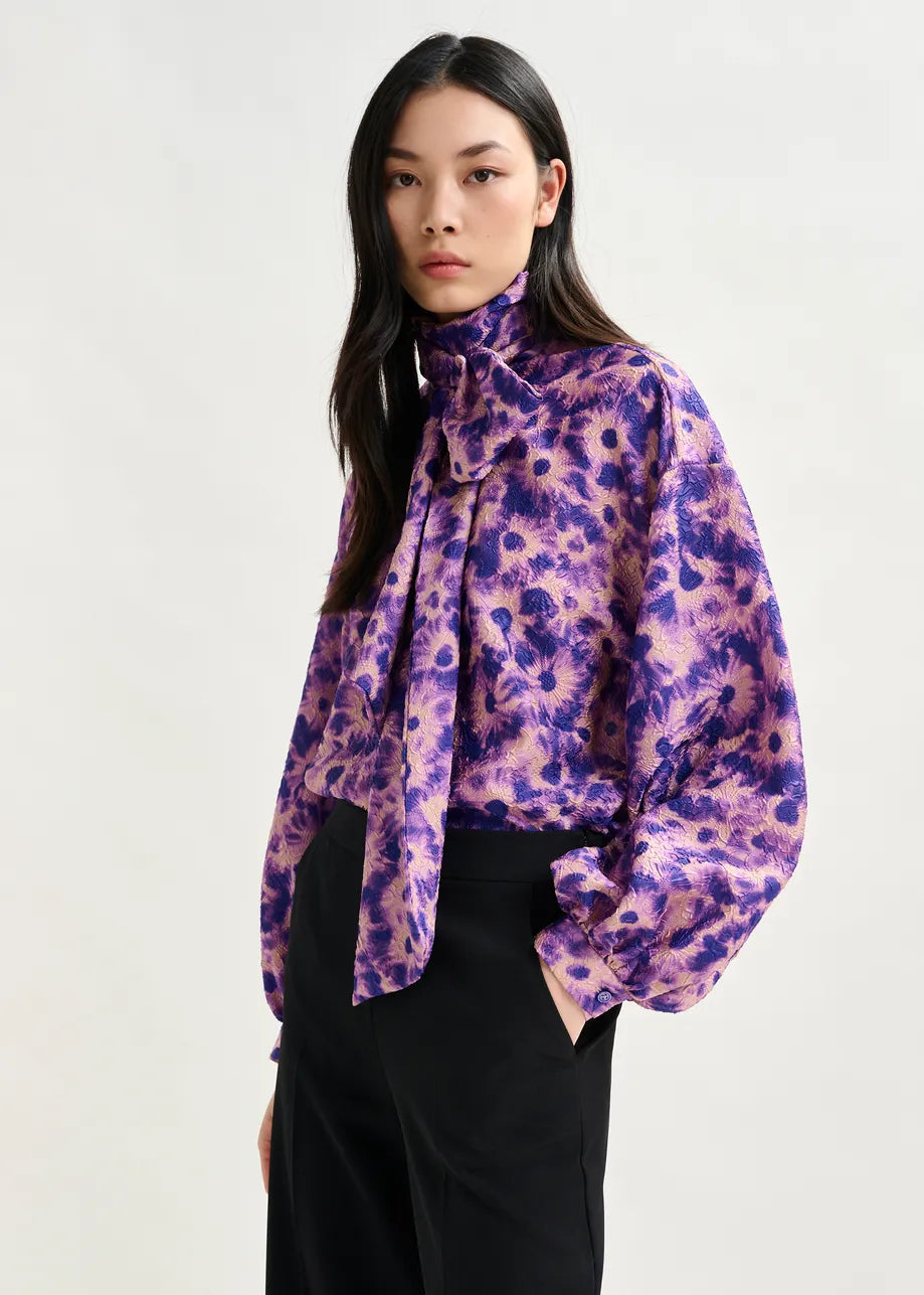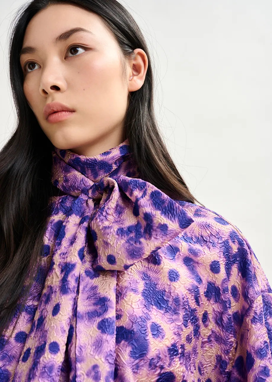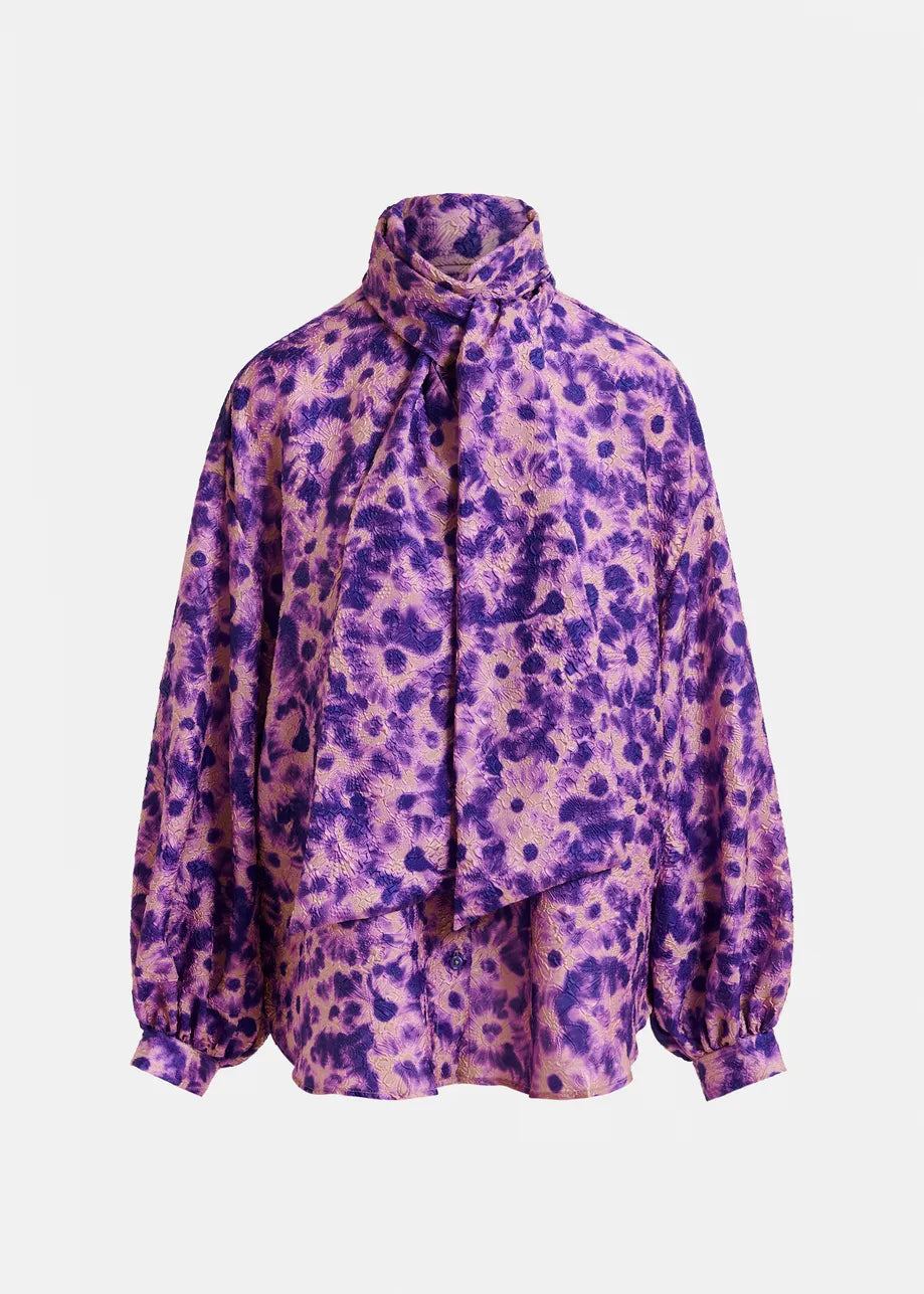 Camicia oversize con bottoni, dotata di versatili nastri al colletto da annodare in un fiocco giocoso oppure lasciati ricadere con eleganza sul davanti e sul retro. Caratterizzata da una stampa floreale jacquard, questa camicia d'effetto presenta spalle basse, maniche voluminose e orlo arrotondato per una silhouette rilassata ma raffinata.
