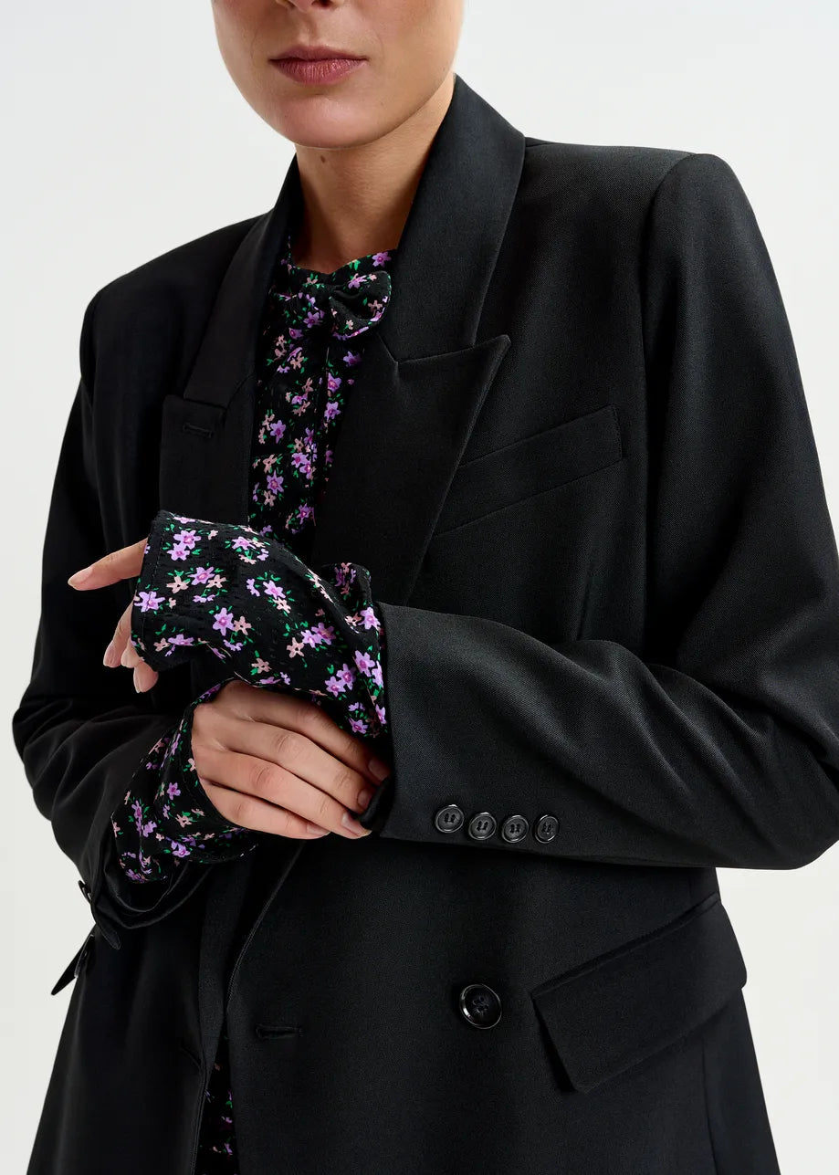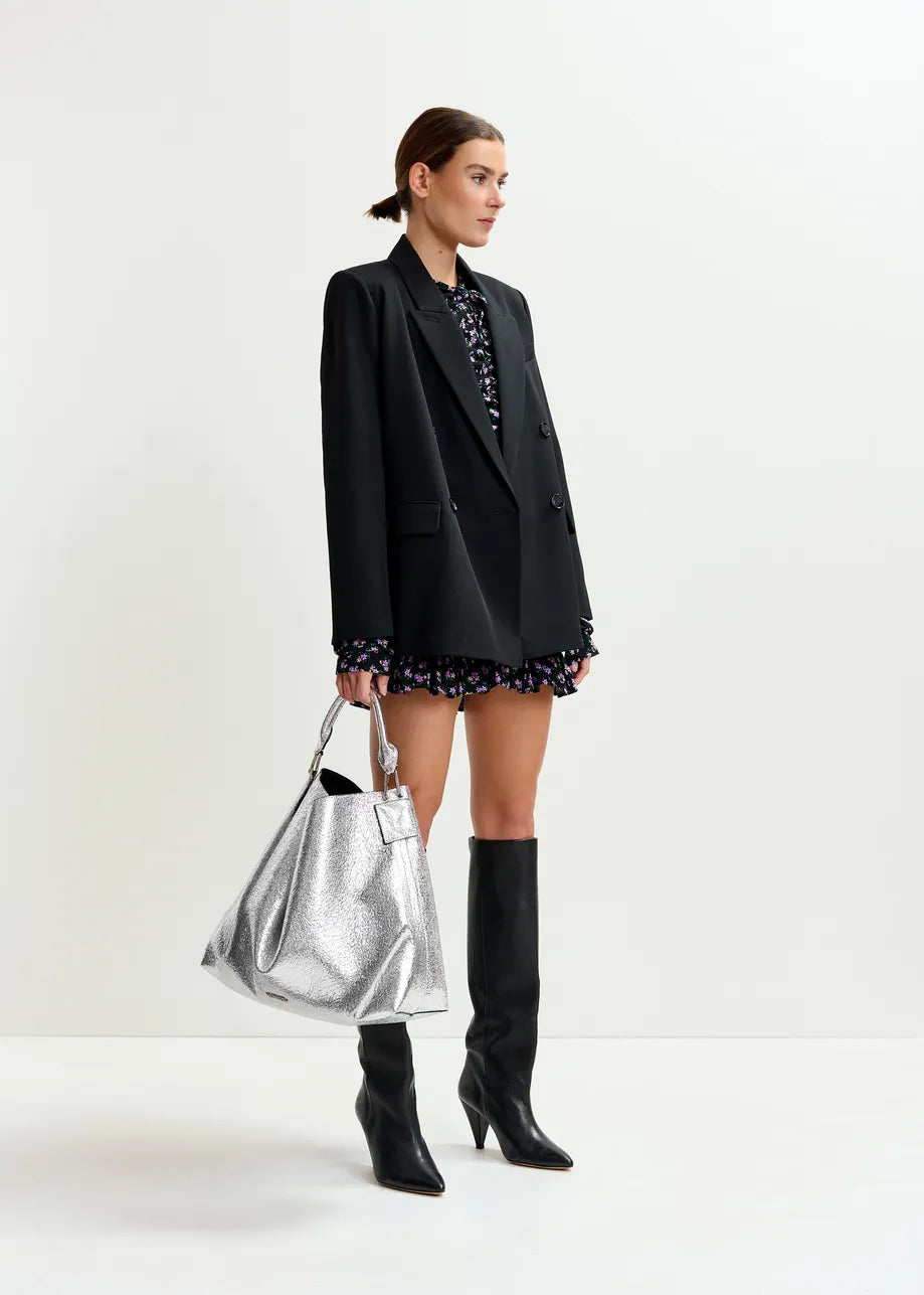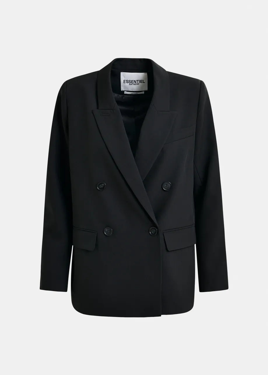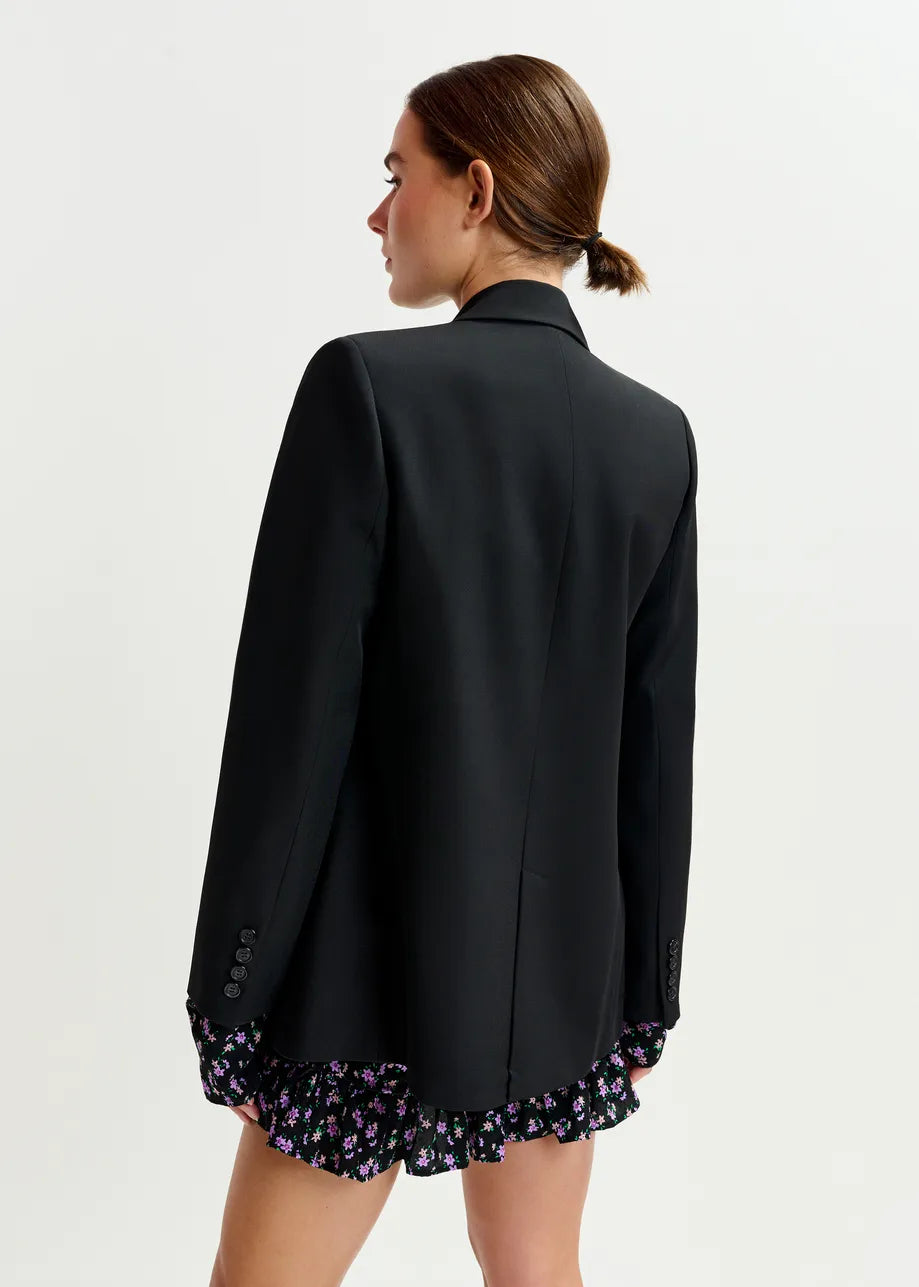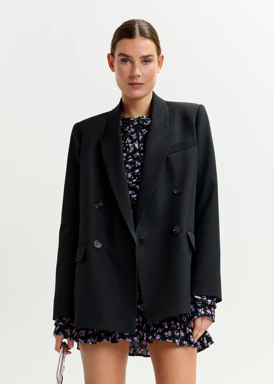 Questo blazer, dal taglio dritto e dalla vestibilità rilassata, unisce eleganza classica e un tocco giocoso. È completato da una chiusura doppiopetto e da spalle imbottite che ne definiscono la struttura. Con due tasche con patta, un taschino sul petto e revers classici, è interamente foderato per offrire comfort e struttura.