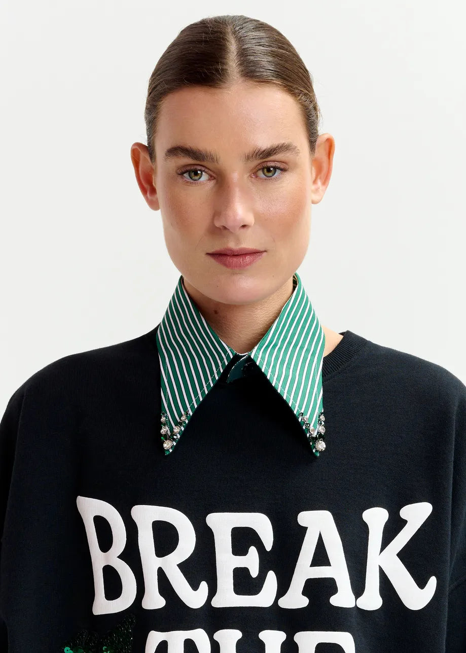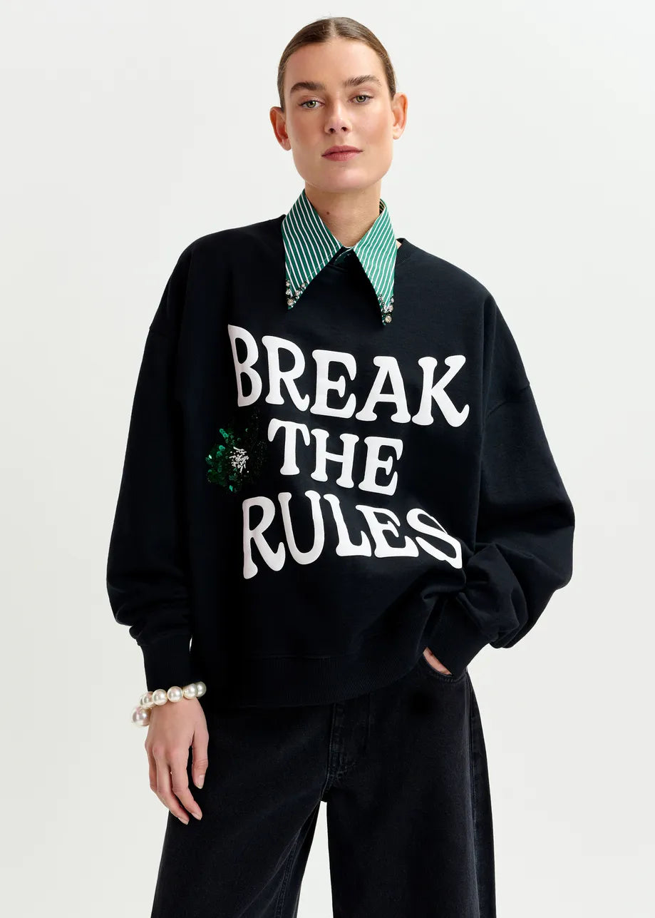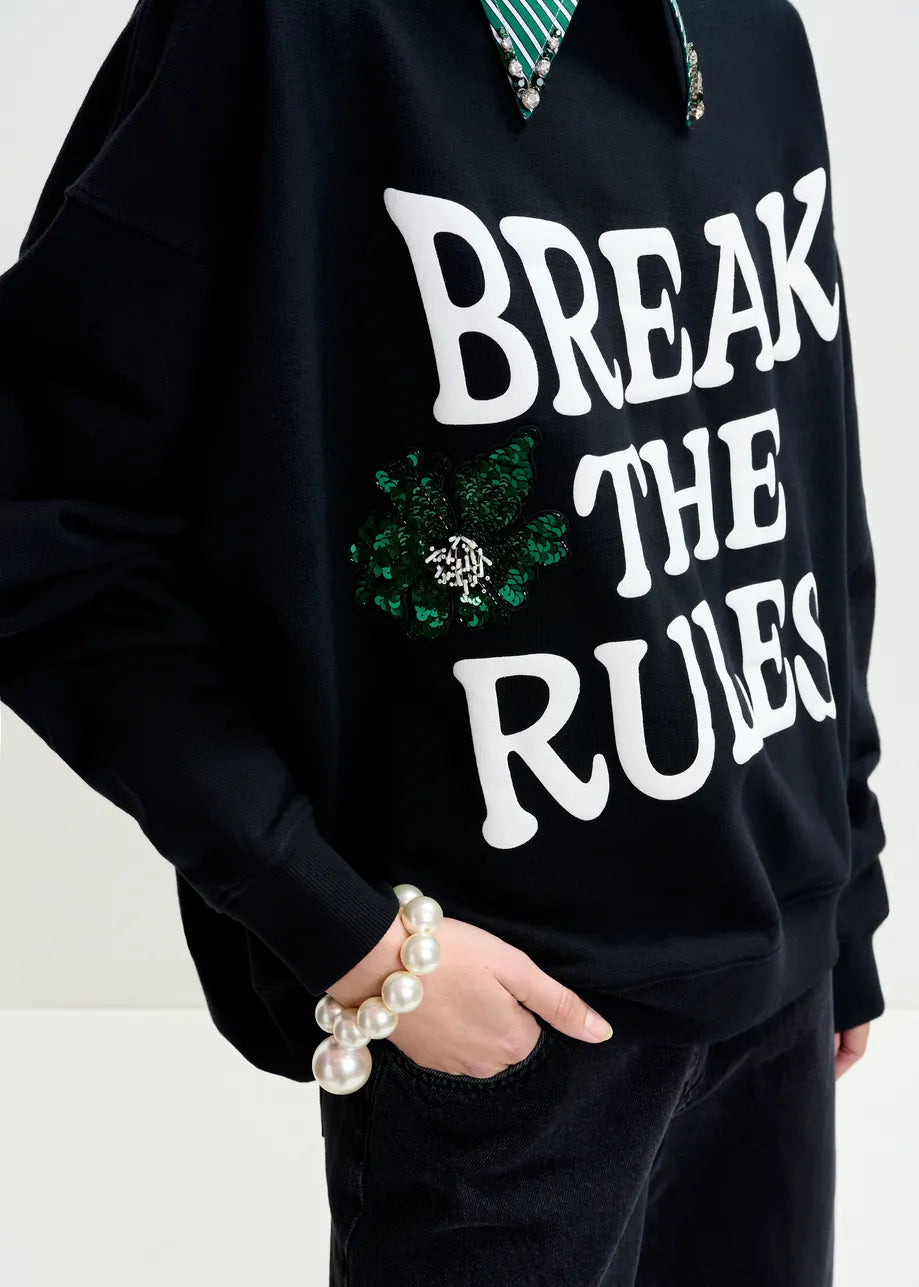 Realizzata in 100% cotone per un comfort che dura tutto il giorno, questa felpa presenta una vestibilità rilassata e spalle scese per una silhouette casual. La parte anteriore mostra un accattivante fiore impreziosito da paillettes e perline, abbinato a un vistoso testo che recita "Break the Rules" perché, a volte, le regole sono fatte per essere infrante.